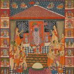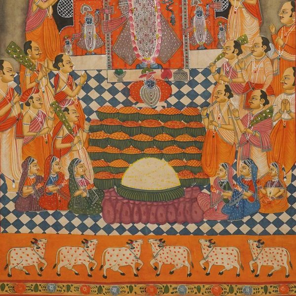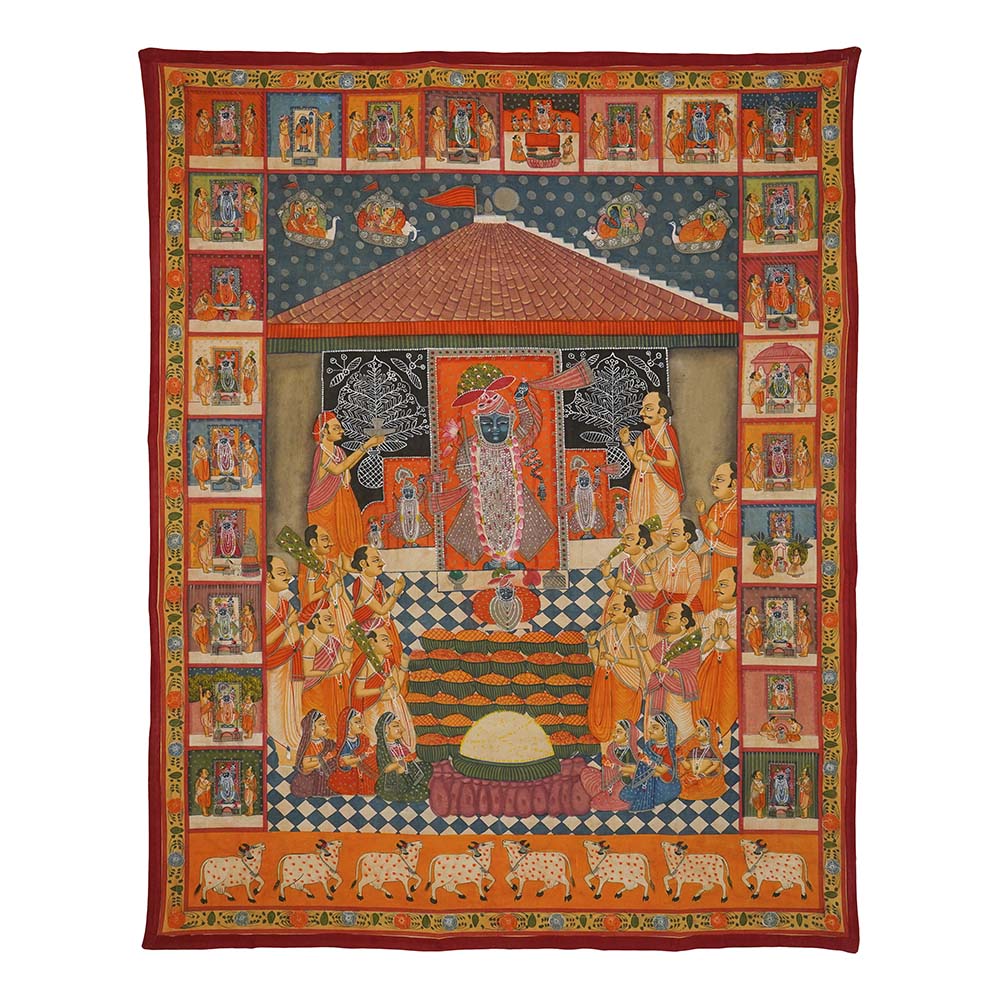 In Nathdwara, Rajasthan, and other Pushtimarg places, they are Textiles hanging behind the idol of Shrinathji, a seven-year-old infant version of Krishna. They set the tone (bhava) for festivals or events on the Vallabhacharya Sampradaya or sect’s liturgical calendar by serving as both a theatrical backdrop and a religious image.