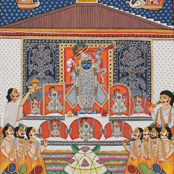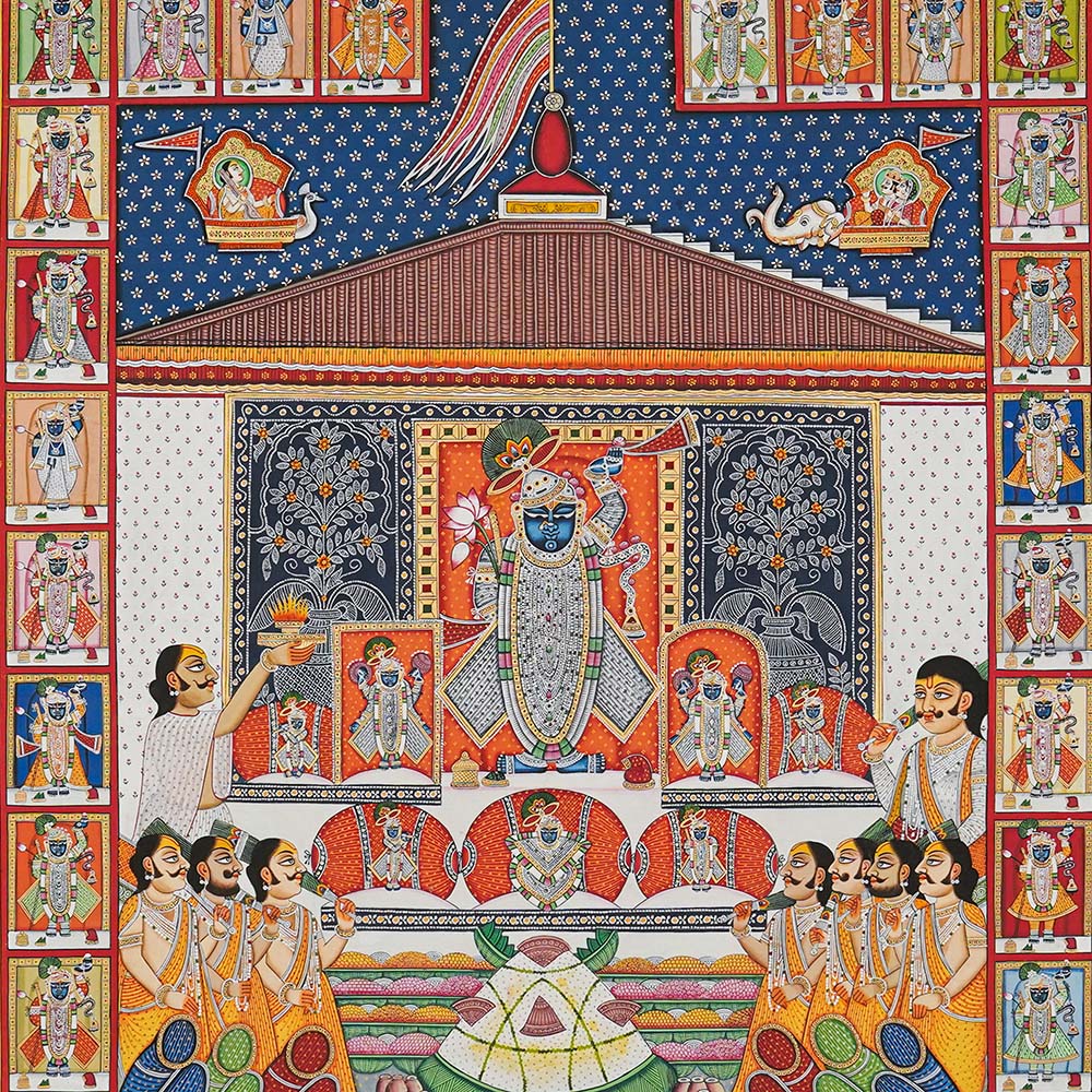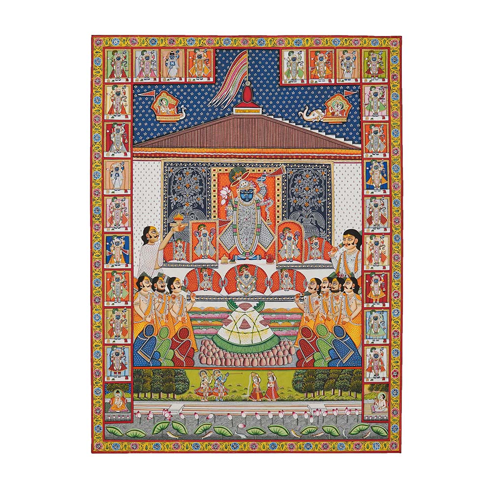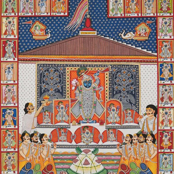 In Nathdwara, Rajasthan, and other Pushtimarg places, they are Textiles hanging behind the idol of Shrinathji, a seven-year-old infant version of Krishna. They set the tone (bhava) for festivals or events on the Vallabhacharya Sampradaya or sect’s liturgical calendar by serving as both a theatrical backdrop and a religious image.