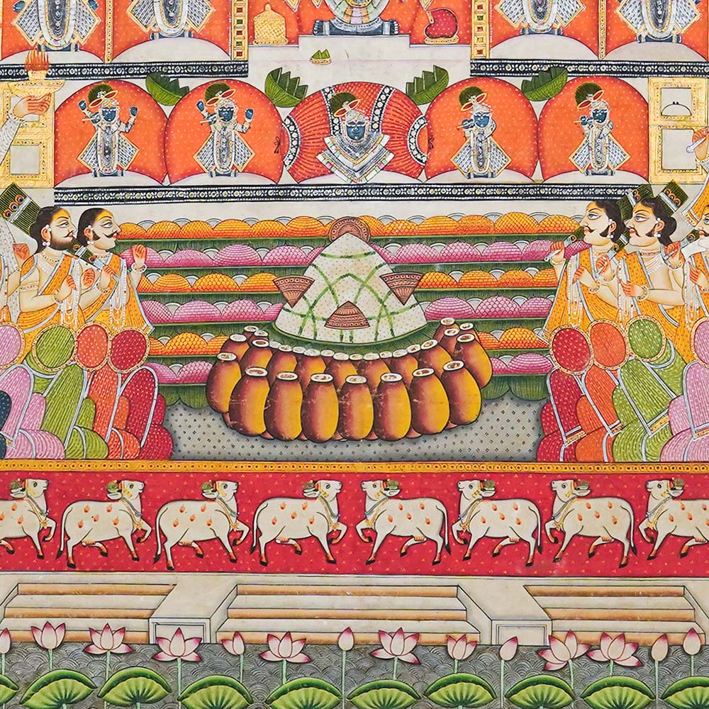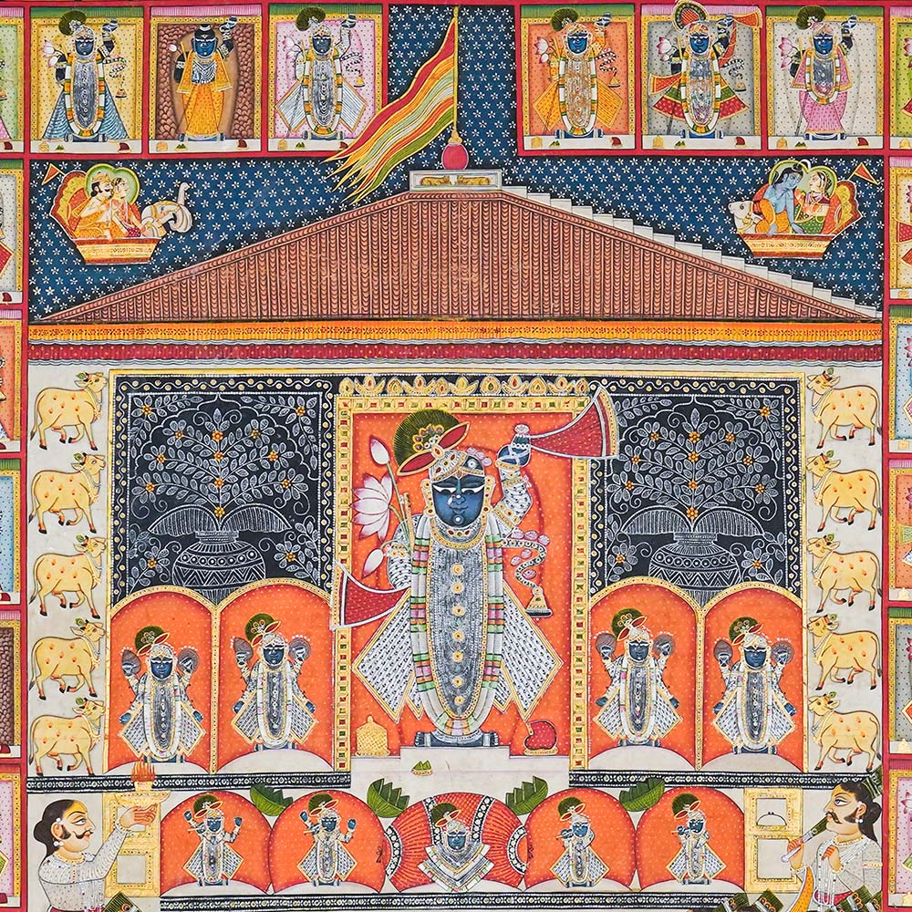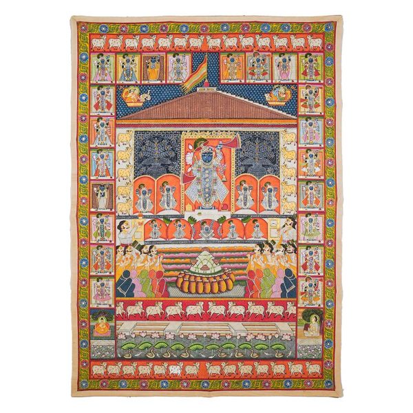 In Nathdwara, Rajasthan, and other Pushtimarg places, they are Textiles hanging behind the idol of Shrinathji, a seven-year-old infant version of Krishna. They set the tone (bhava) for festivals or events on the Vallabhacharya Sampradaya or sect’s liturgical calendar by serving as both a theatrical backdrop and a religious image.