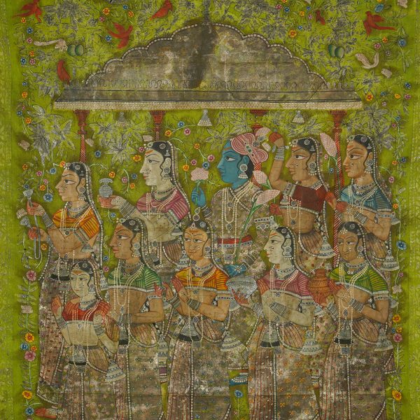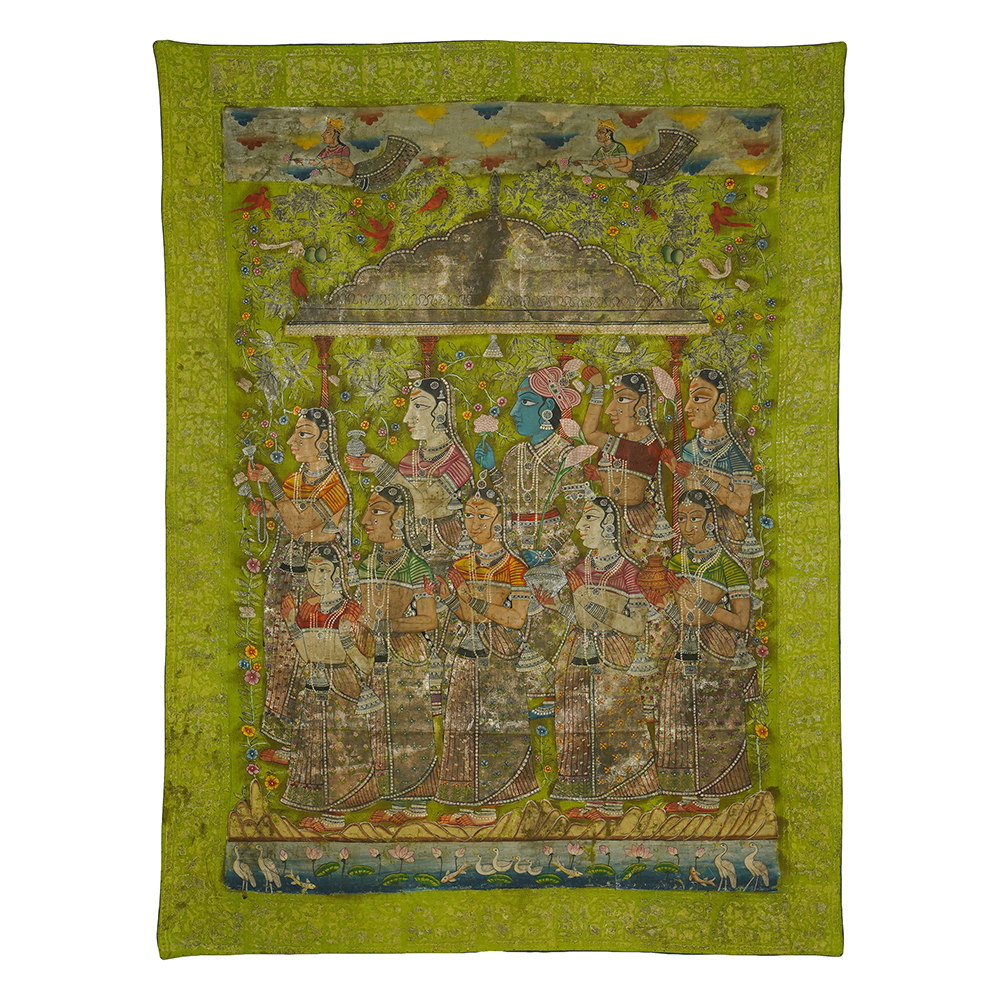 In Nathdwara, Rajasthan, and other Pushtimarg places, they are Textiles hanging behind the idol of Shrinathji, a seven-year-old infant version of Krishna. They set the tone (bhava) for festivals or events on the Vallabhacharya Sampradaya or sect’s liturgical calendar by serving as both a theatrical backdrop and a religious image.
