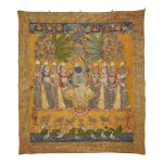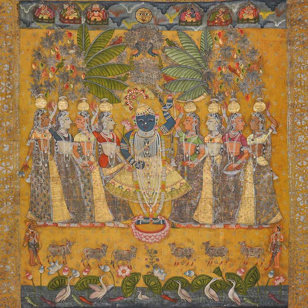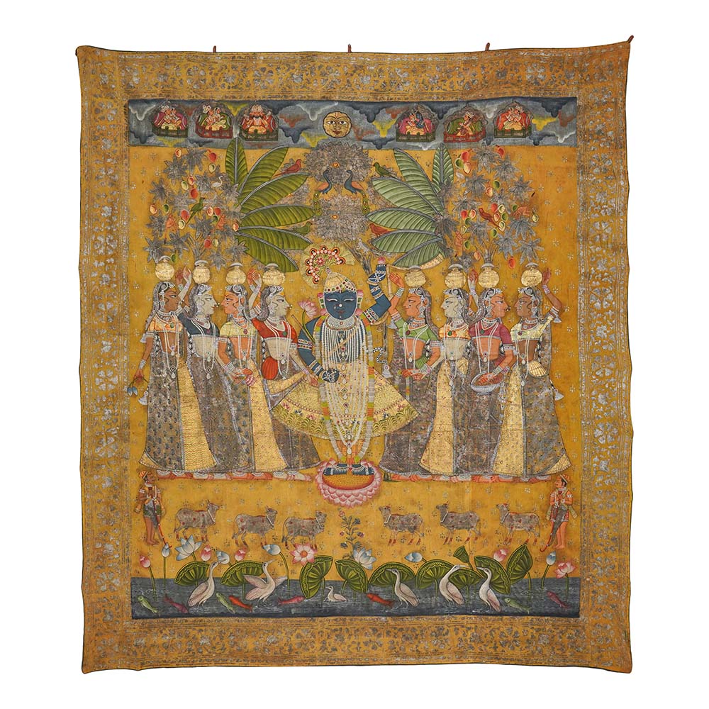 In Nathdwara, Rajasthan, and other Pushtimarg places, they are Textiles hanging behind the idol of Shrinathji, a seven-year-old infant version of Krishna. They set the tone (bhava) for festivals or events on the Vallabhacharya Sampradaya or sect’s liturgical calendar by serving as both a theatrical backdrop and a religious image.