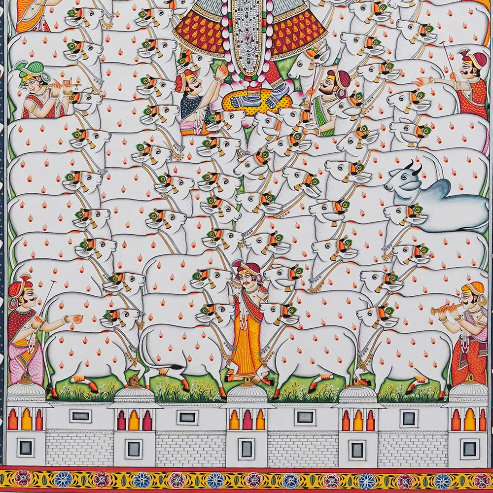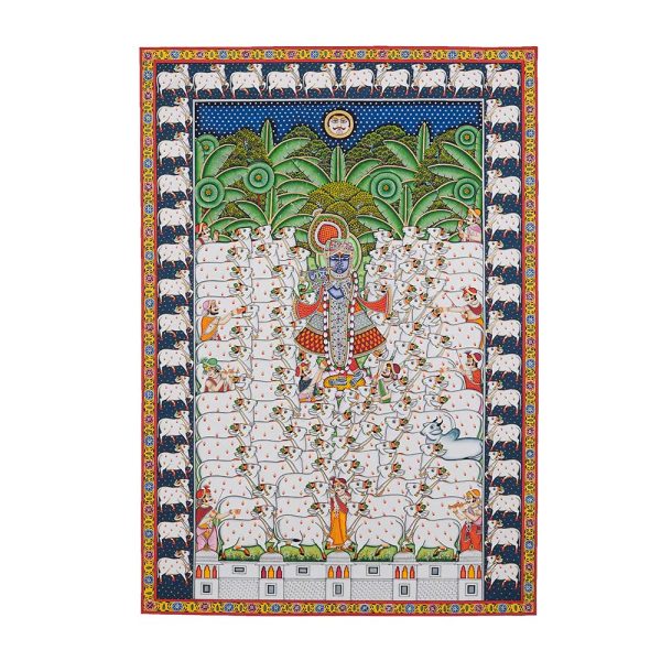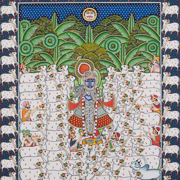 In Nathdwara, Rajasthan, and other Pushtimarg places, they are Textiles hanging behind the idol of Shrinathji, a seven-year-old infant version of Krishna. They set the tone (bhava) for festivals or events on the Vallabhacharya Sampradaya or sect’s liturgical calendar by serving as both a theatrical backdrop and a religious image.