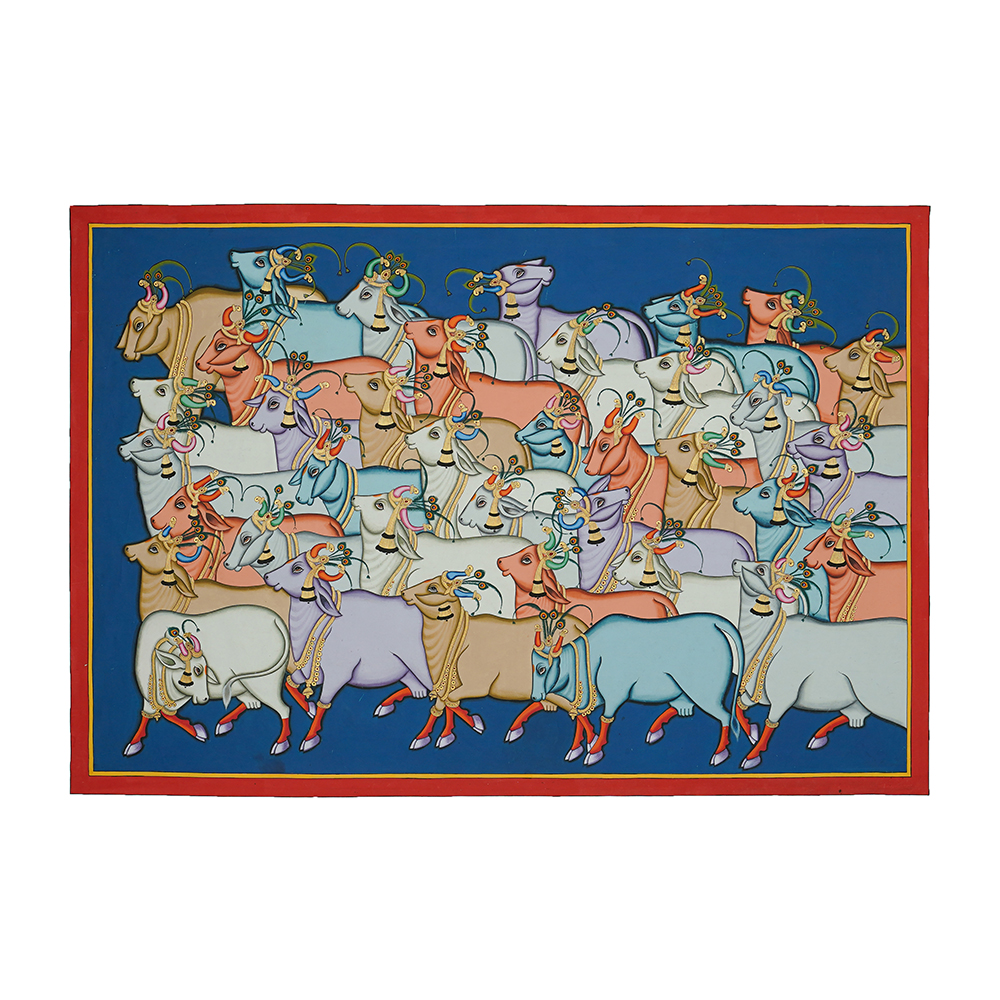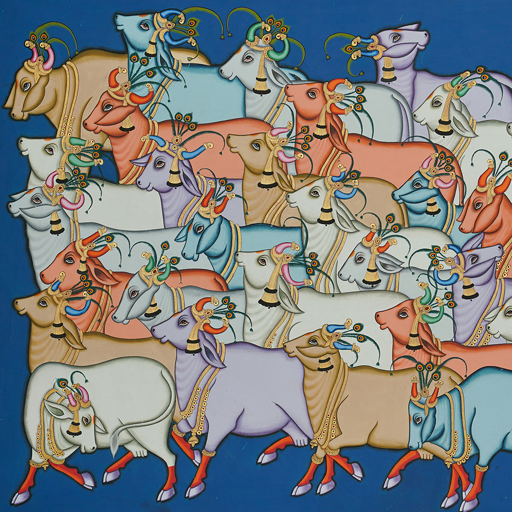 The pichwais are painted using stone colors and gold leaf and are also made with hand embroidery. They can be made of brocade and thick silk, stitched, painted, and dyed, tinsel printed, block printed, or even constructed of machine-made lace. Though pichwais were mostly created in Gujarat and Rajasthan, there are a few specimens from the Deccan as well as machine-made lace or roller-printed pichwais from Europe. Creating a Pichwai is an elaborate and time-consuming process, amazing details are achieved by expert artists using natural colors and brushes. The Pichwais are changed at the temple daily, according to the seasons, and for various rites and celebrations. Pichwais depict celebrations and festivals such as Sharad Purnima, Raas Leela, Annakoot or Govardhan Puja, Janmashtami, Gopashtami, Nand Mahotsav, Diwali, and Holi.