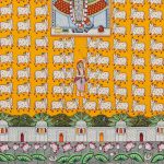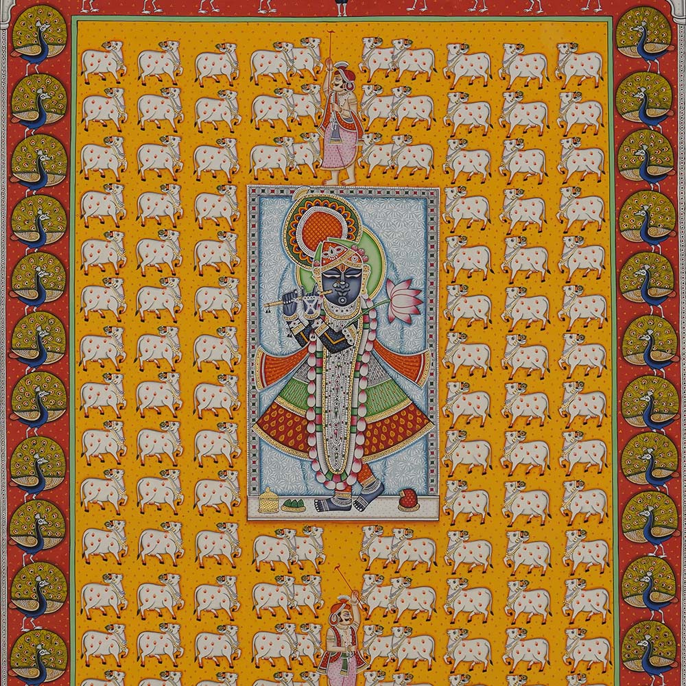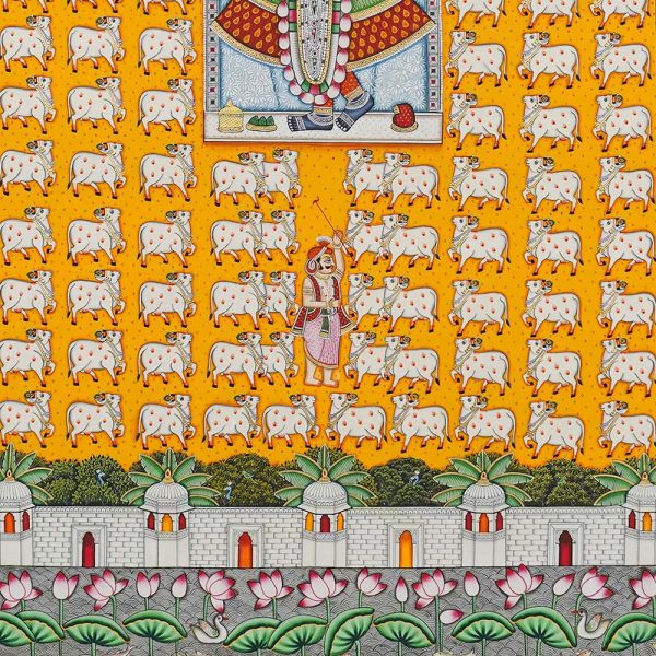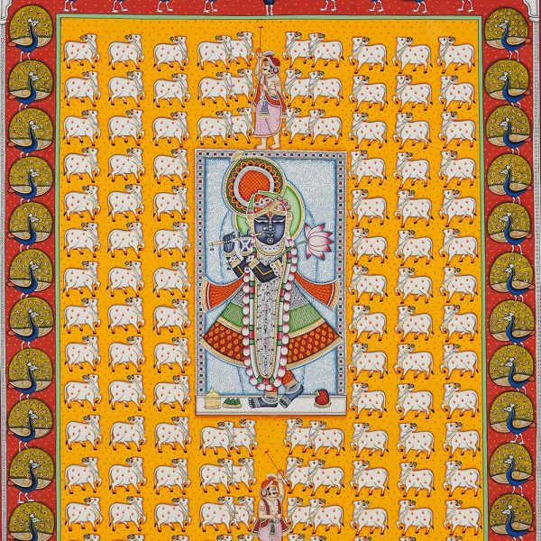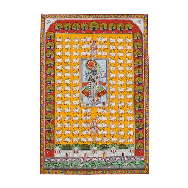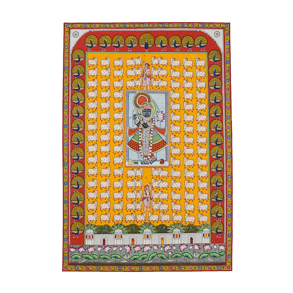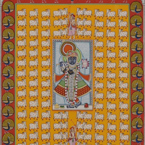 In Nathdwara, Rajasthan, and other Pushtimarg places, they are Textiles hanging behind the idol of Shrinathji, a seven-year-old infant version of Krishna. They set the tone (bhava) for festivals or events on the Vallabhacharya Sampradaya or sect’s liturgical calendar by serving as both a theatrical backdrop and a religious image.