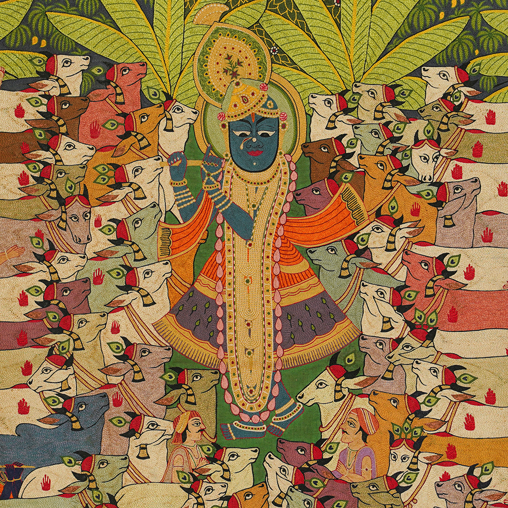 In Nathdwara, Rajasthan, and other Pushtimarg places, they are Textiles hanging behind the idol of Shrinathji, a seven-year-old infant version of Krishna. They set the tone (bhava) for festivals or events on the Vallabhacharya Sampradaya or sect’s liturgical calendar by serving as both a theatrical backdrop and a religious image.