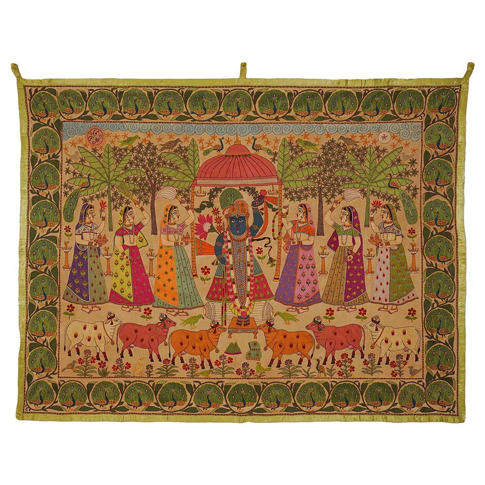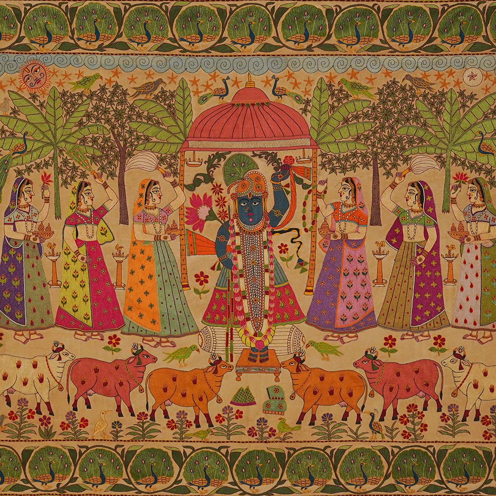 In Nathdwara, Rajasthan, and other Pushtimarg places, they are Textiles hanging behind the idol of Shrinathji, a seven-year-old infant version of Krishna. They set the tone (bhava) for festivals or events on the Vallabhacharya Sampradaya or sect’s liturgical calendar by serving as both a theatrical backdrop and a religious image.