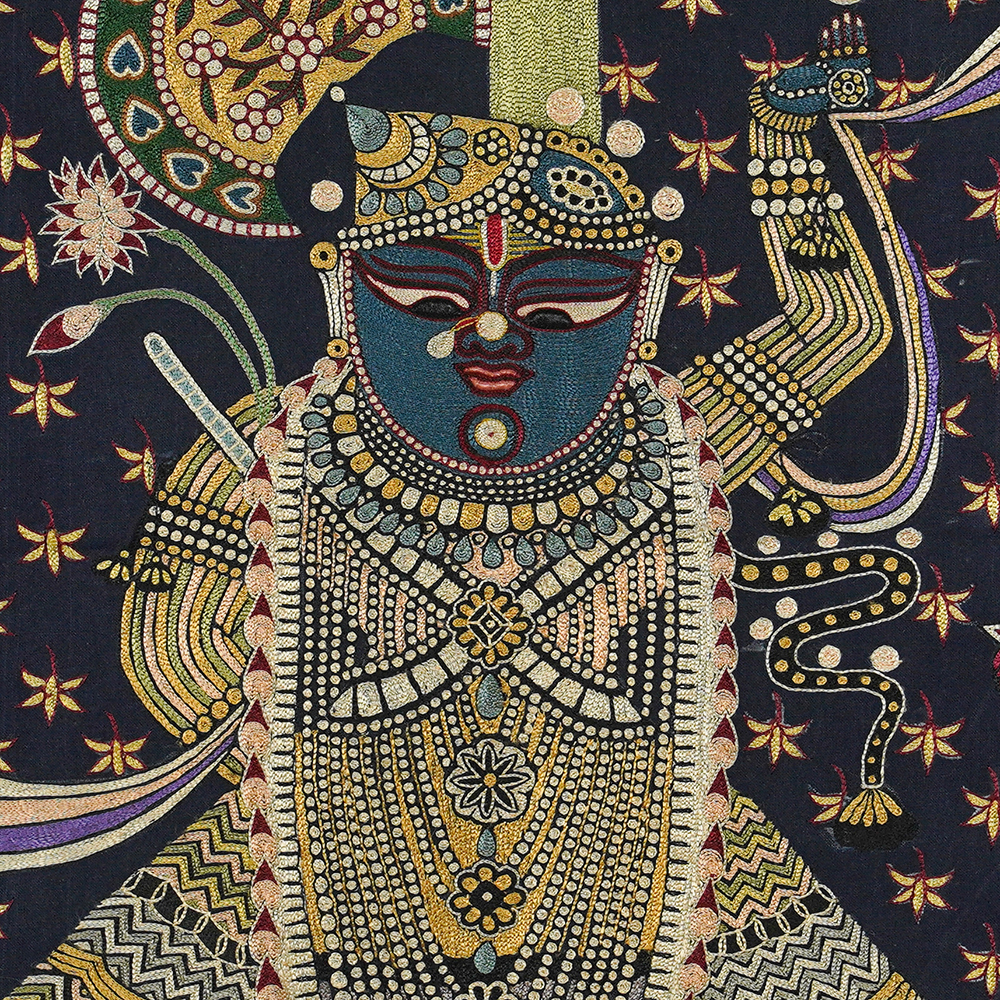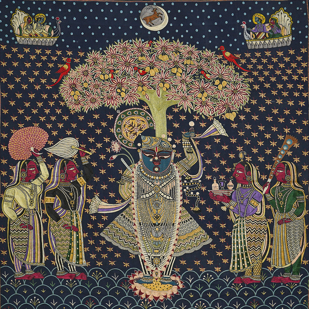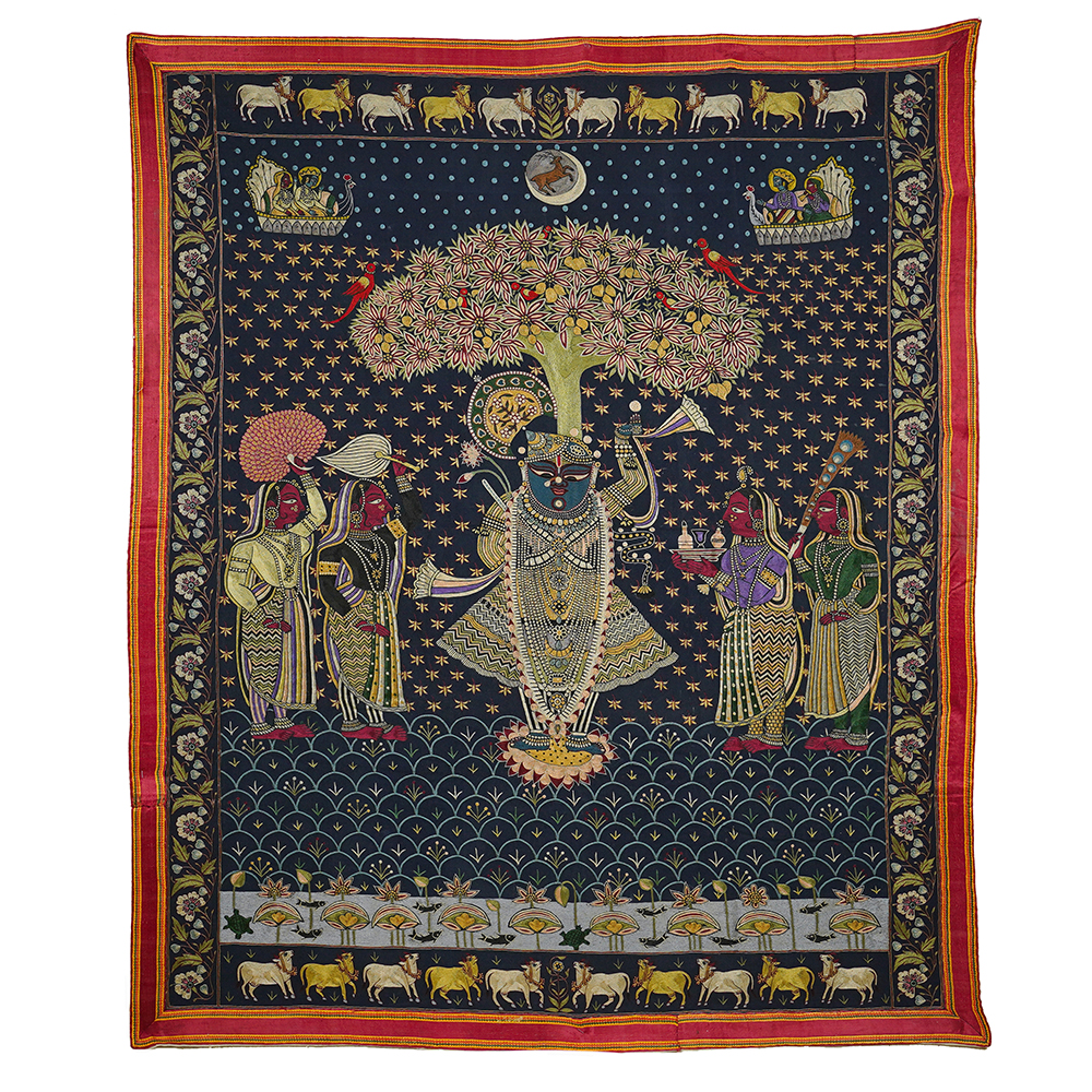 In Nathdwara, Rajasthan, and other Pushtimarg places, they are Textiles hanging behind the idol of Shrinathji, a seven-year-old infant version of Krishna. They set the tone (bhava) for festivals or events on the Vallabhacharya Sampradaya or sect’s liturgical calendar by serving as both a theatrical backdrop and a religious image.