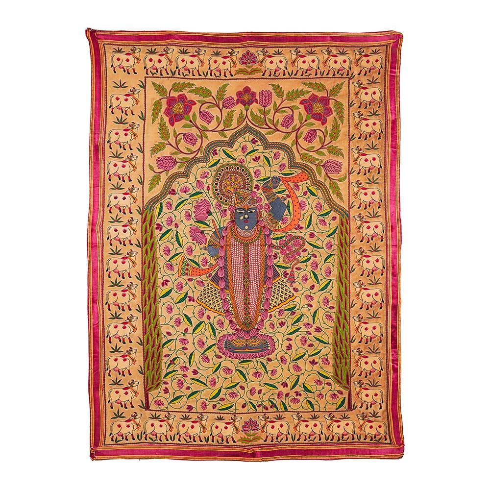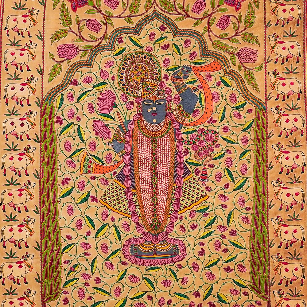 In Nathdwara, Rajasthan, and other Pushtimarg places, they are Textiles hanging behind the idol of Shrinathji, a seven-year-old infant version of Krishna. They set the tone (bhava) for festivals or events on the Vallabhacharya Sampradaya or sect’s liturgical calendar by serving as both a theatrical backdrop and a religious image.