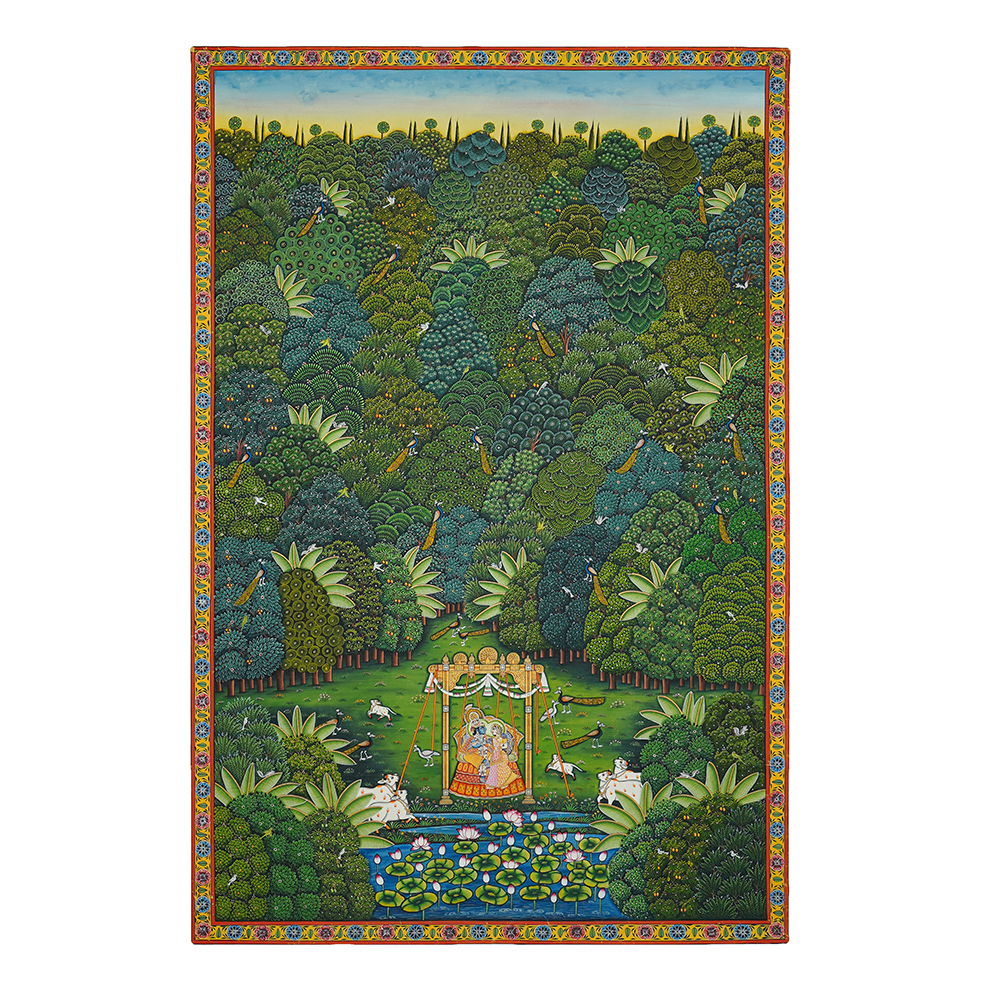 In Nathdwara, Rajasthan, and other Pushtimarg places, they are Textiles hanging behind the idol of Shrinathji, a seven-year-old infant version of Krishna. They set the tone (bhava) for festivals or events on the Vallabhacharya Sampradaya or sect’s liturgical calendar by serving as both a theatrical backdrop and a religious image.