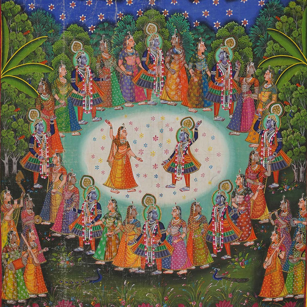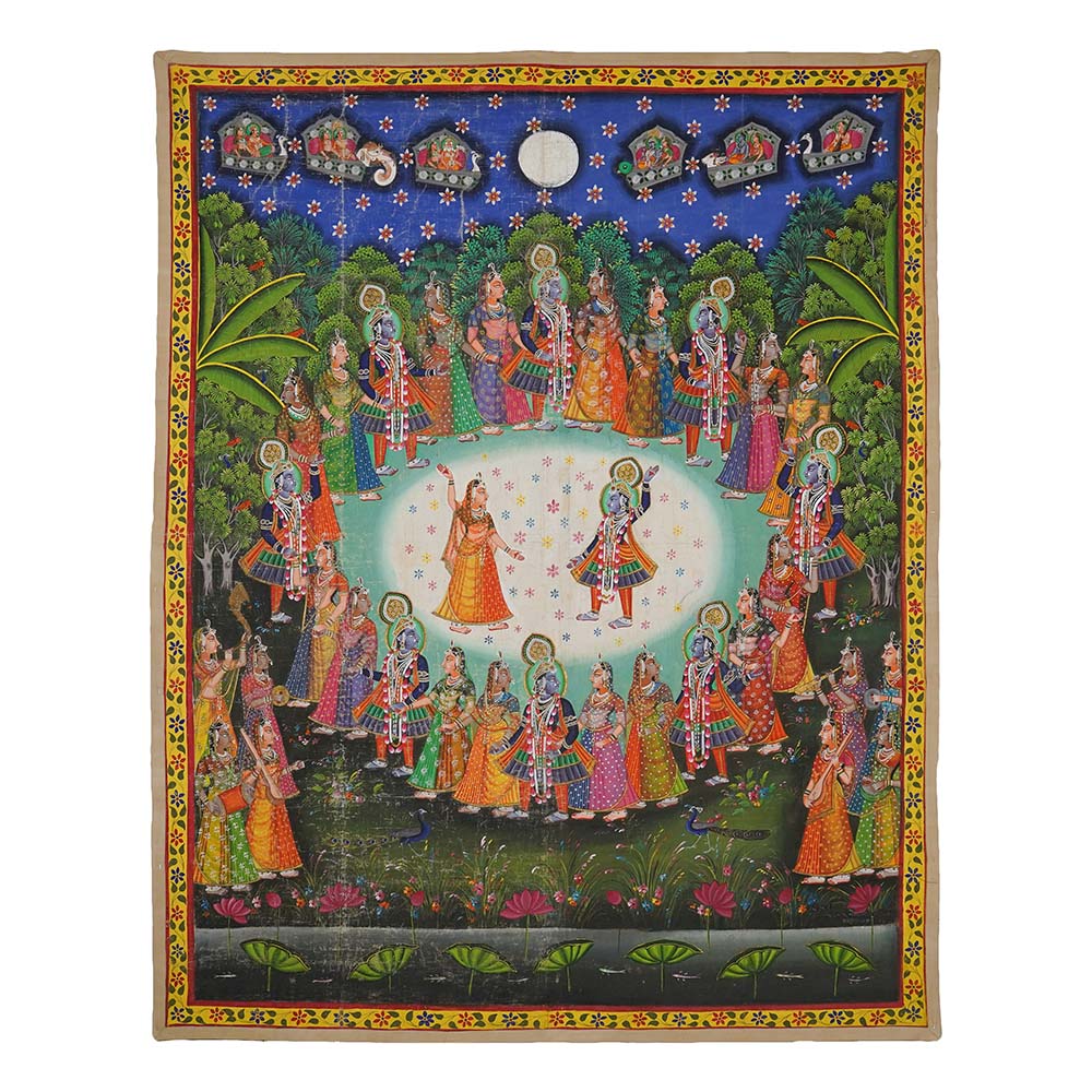 In Nathdwara, Rajasthan, and other Pushtimarg places, they are Textiles hanging behind the idol of Shrinathji, a seven-year-old infant version of Krishna. They set the tone (bhava) for festivals or events on the Vallabhacharya Sampradaya or sect’s liturgical calendar by serving as both a theatrical backdrop and a religious image.
