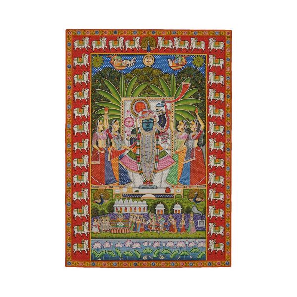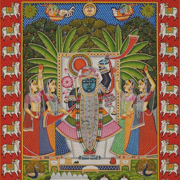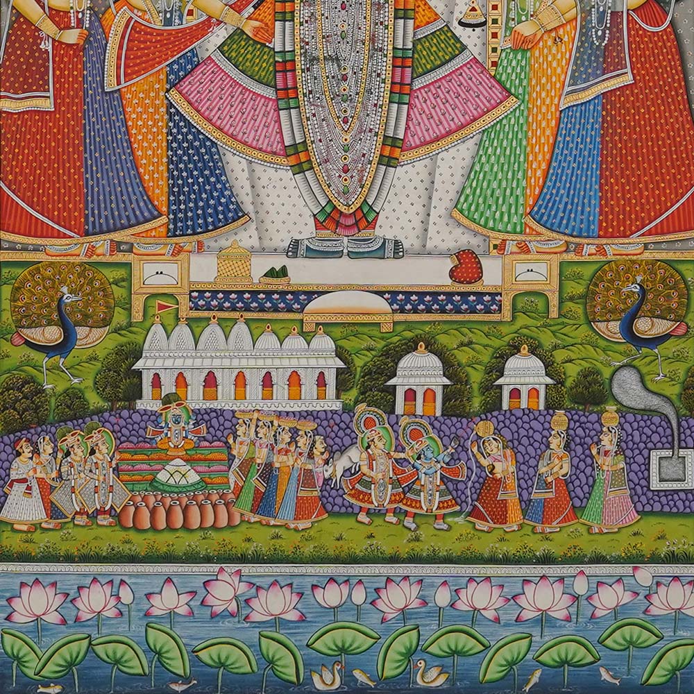 In Nathdwara, Rajasthan, and other Pushtimarg places, they are Textiles hanging behind the idol of Shrinathji, a seven-year-old infant version of Krishna. They set the tone (bhava) for festivals or events on the Vallabhacharya Sampradaya or sect’s liturgical calendar by serving as both a theatrical backdrop and a religious image.