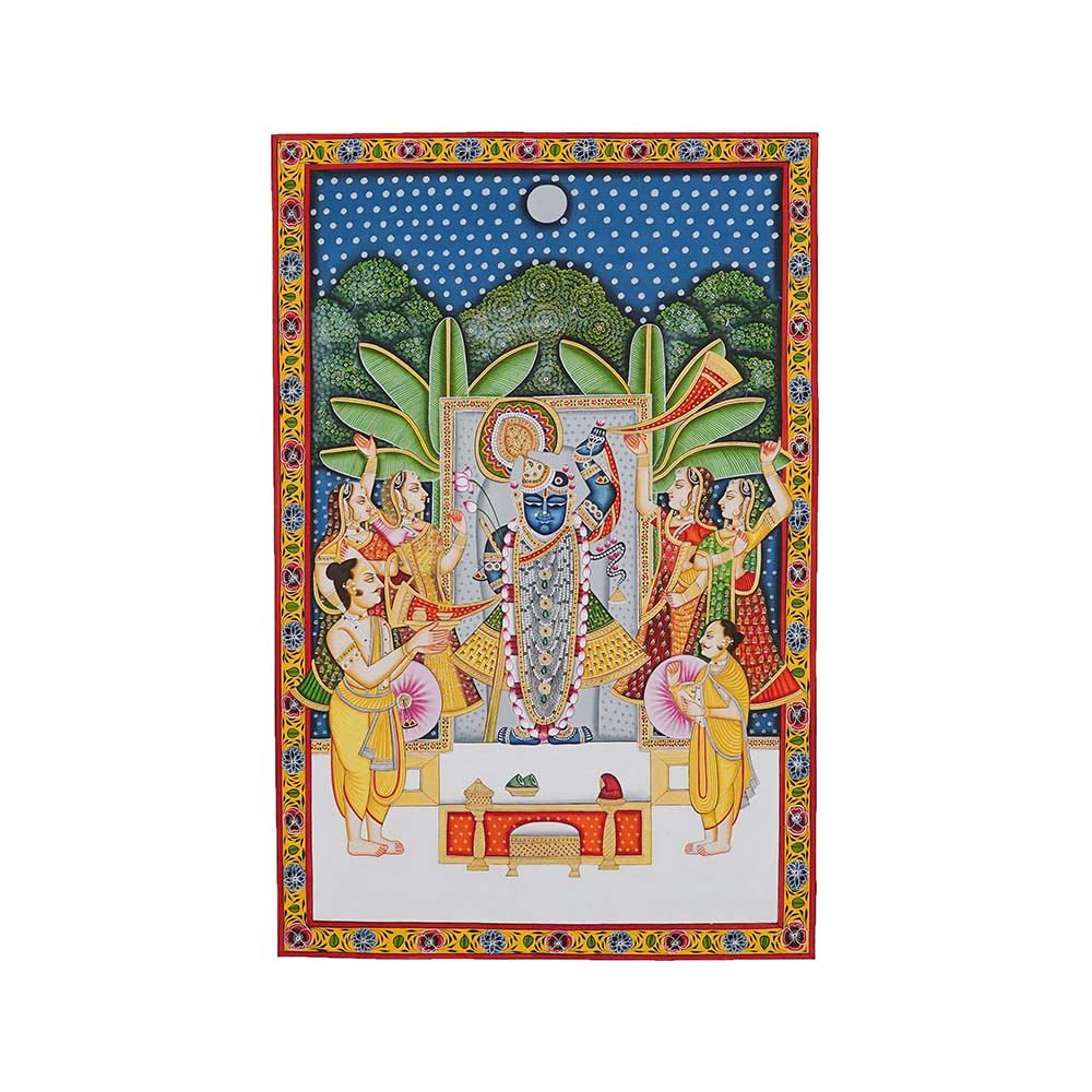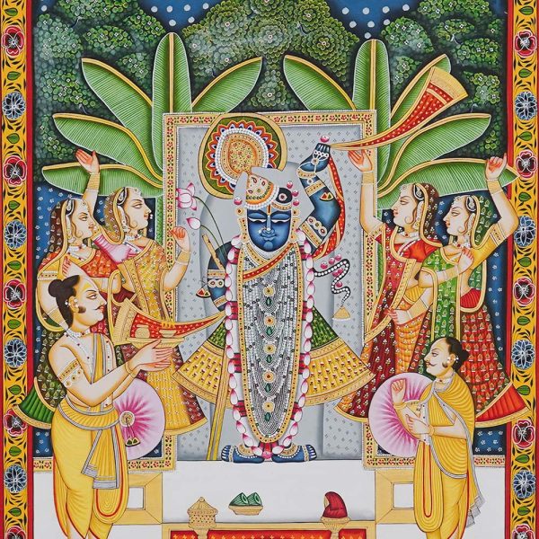 In Nathdwara, Rajasthan, and other Pushtimarg places, they are Textiles hanging behind the idol of Shrinathji, a seven-year-old infant version of Krishna. They set the tone (bhava) for festivals or events on the Vallabhacharya Sampradaya or sect’s liturgical calendar by serving as both a theatrical backdrop and a religious image.