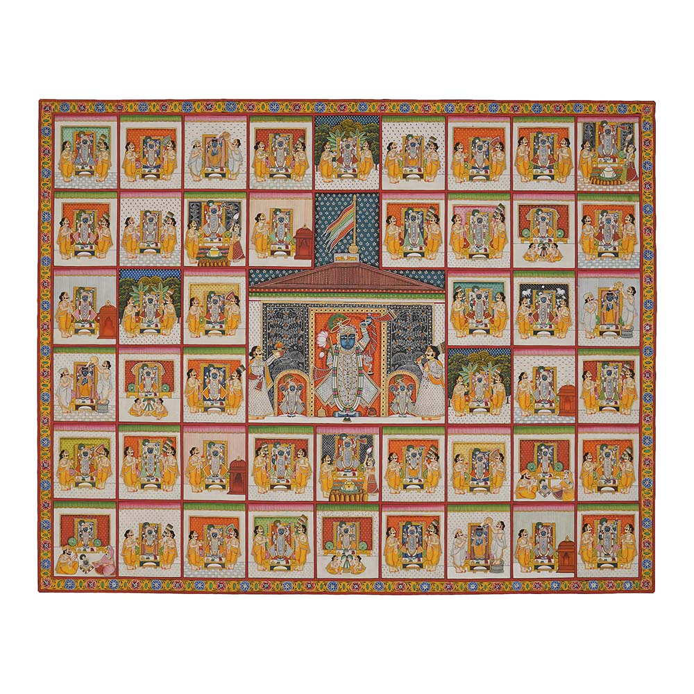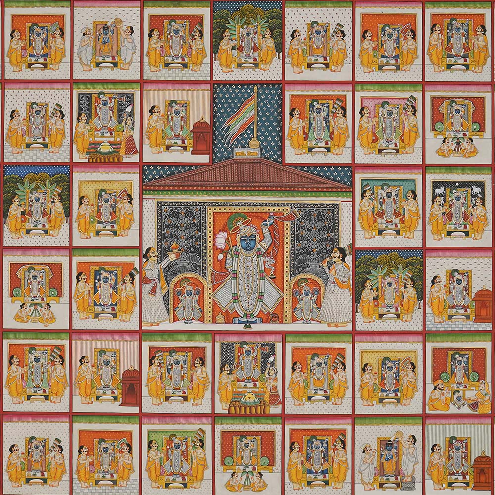 In Nathdwara, Rajasthan, and other Pushtimarg places, they are Textiles hanging behind the idol of Shrinathji, a seven-year-old infant version of Krishna. They set the tone (bhava) for festivals or events on the Vallabhacharya Sampradaya or sect’s liturgical calendar by serving as both a theatrical backdrop and a religious image.
