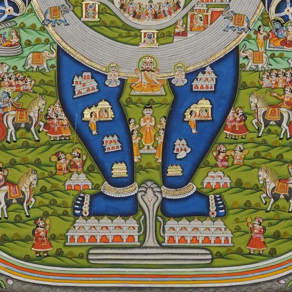 In Nathdwara, Rajasthan, and other Pushtimarg places, they are Textiles hanging behind the idol of Shrinathji, a seven-year-old infant version of Krishna. They set the tone (bhava) for festivals or events on the Vallabhacharya Sampradaya or sect’s liturgical calendar by serving as both a theatrical backdrop and a religious image.